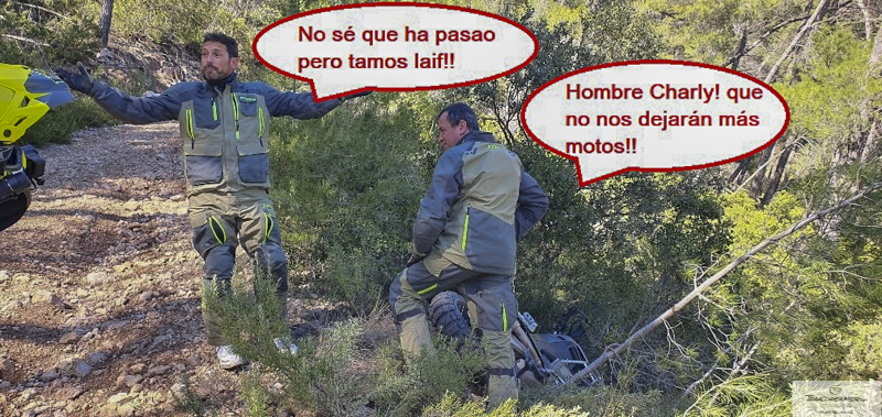 Héctor seguía tirando de lo lindo y ninguno nos quejábamos, en cada parada las caras de satisfacción eran evidentes hasta que en una subida de repente Charly perdió el control de su moto que desapareció en un terraplén. No era una zona rápida y aún no sabemos que pasó, una roca escondida, una rama que lo desequilibró… lo cierto es que él ni se cayó y quedó de pie en el camino con cara de no entender nada. Por suerte la moto descansó sobre unos matorrales. No tenía ni una rayada pero sacarla de allí nos costó un buen rato y una sudada. Todo acabó con risas y pudimos seguir nuestra ruta.